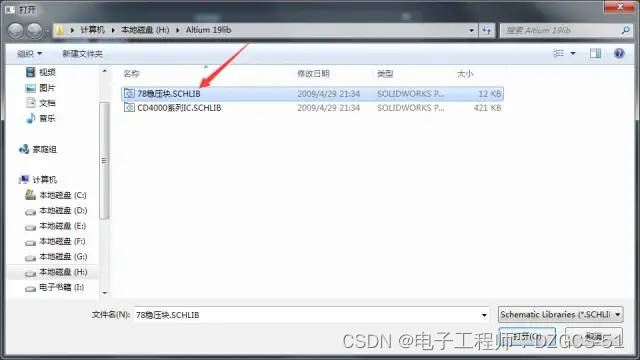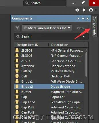 对于工具栏中没有的元件,点击左侧第五个按钮进入库,可以在自己建立的库中选择刚绘制的元件。点击所需器件名称,将其拖动到绘制区域即可。