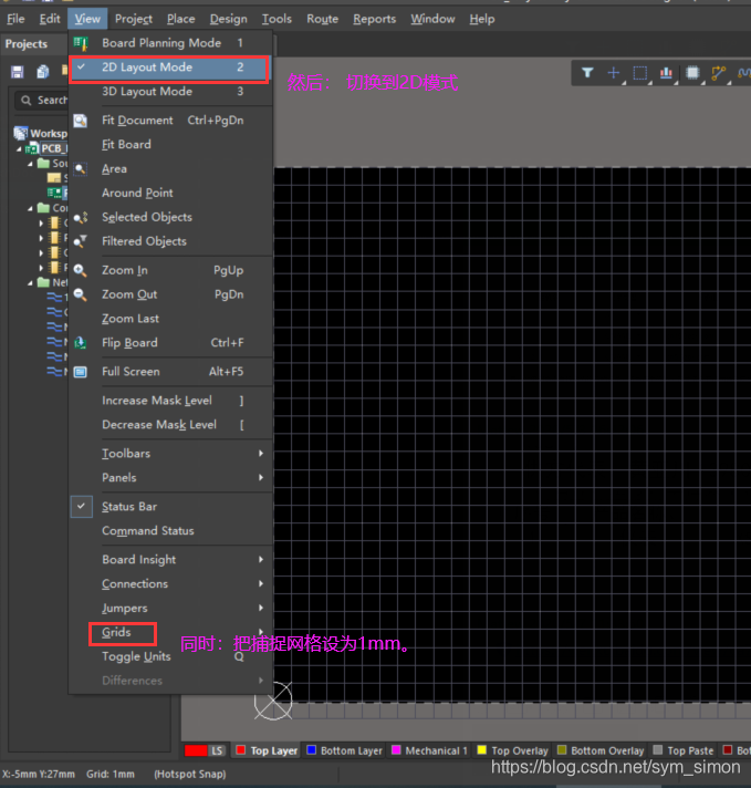 3步 通过 View --> Toggle Units 将度量单位 从英制mil 改成了 公制mm