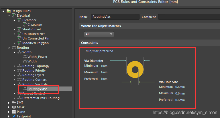 3)过孔大小设置(内径0.6mm、外径1.0mm)