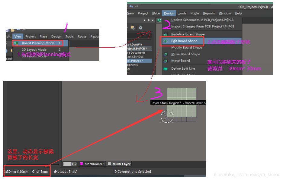 例如,本例的谐振电路,我们初步设置为30mm * 30mm的正方形大小。 一般来说,PCB板都是正方形或长方形。