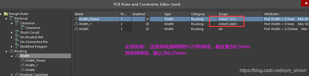 我们新建一个走线宽度,并置优先级为1(高); 推荐值为0.5mm; 最小和最大值分别为0.25mm; 0.5mm.