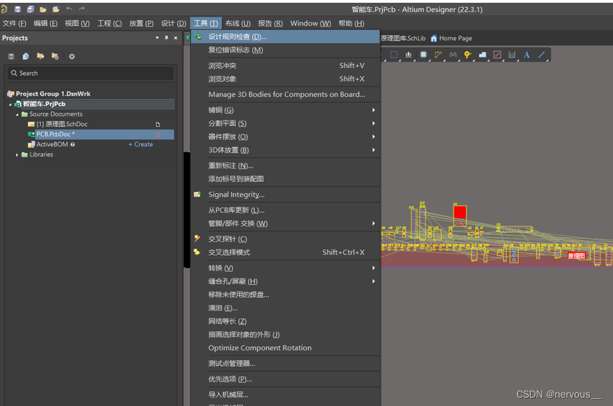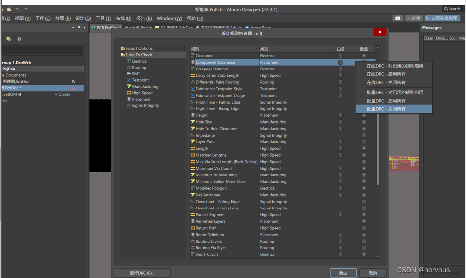 步骤:工具->设计规则检查中,将在线DRC和批量DRC全部关掉,并将Electrical全部打开。
