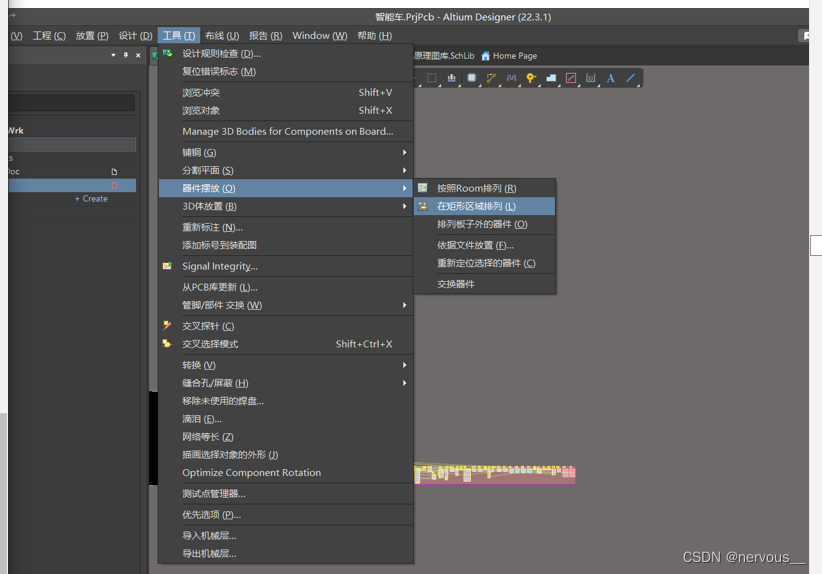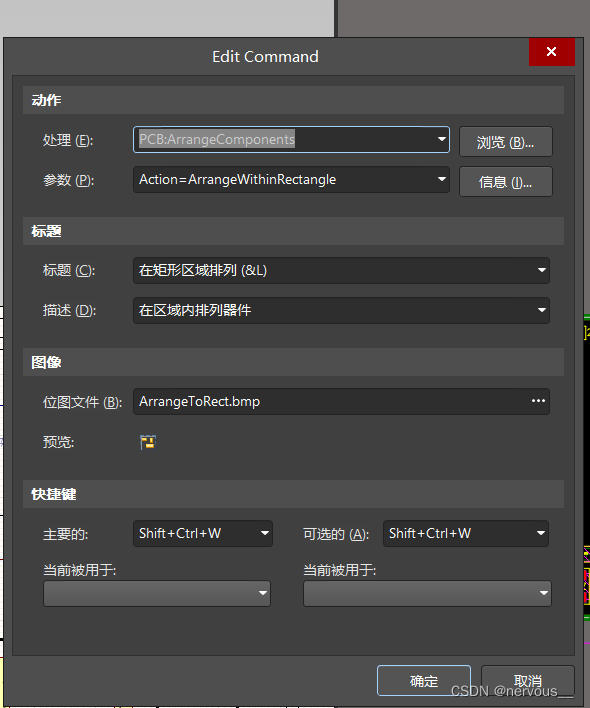 选中器件后,点击工具中的器件摆放,选择在矩形区域排列,可按住Ctrl,再左击鼠标点击在矩形区域排列,修改快捷键方式,其它的快捷键修改方式类似。