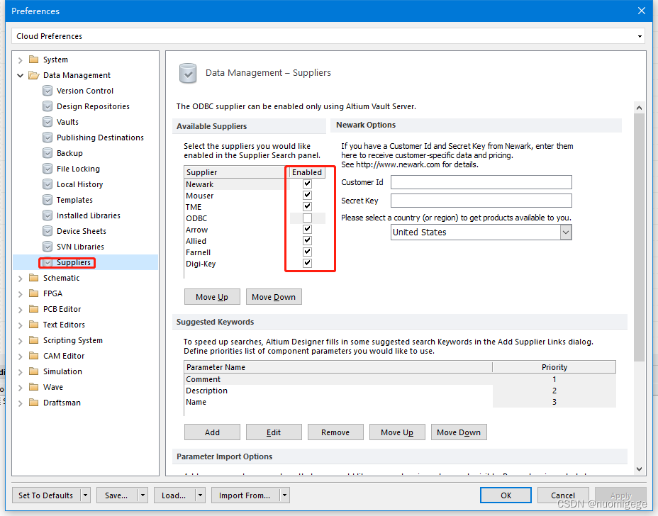 经过反复寻找规律。发现是由于在红色箭头的器件的属性 参数里面 Paremeters 有好多选项,其中有supplier。删除这些参数后,恢复正常。猜测原因可能, AD软件 正在联网索引供应商的 信息 。
