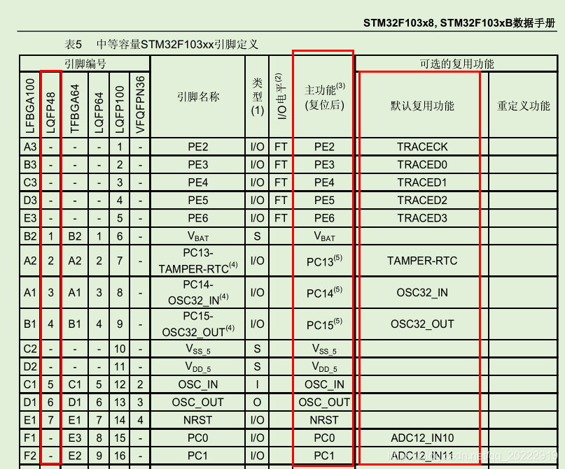 这里选用48引脚的STM32F103C8T6来演示,首先找到官方的数据手册中找到芯片引脚的表格。