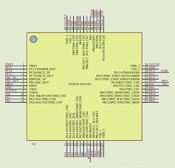 今天就来总结一下如何通过Excel 表格快速的将引脚功能导入到 Altium Designer 原理图库中去。比如要新建一个类似下图这种的的单片机芯片库。