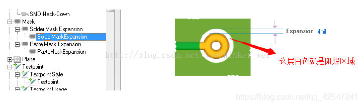 solder mask,按其英文直译是焊料蒙版或焊料掩模,可理解为在整张膜上开洞(mask),便于焊料焊接;阻焊层solder mask是指板子上要上绿油的部分;因为它是负片输出,所以实际上有solder mask的部分实际效果并不上绿油,而是镀锡,呈银白色,防止焊锡外漏!其大小往往比焊盘大一圈。