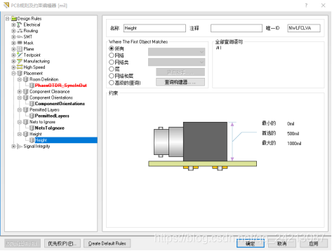 “Height”规则主要用于设置愿你见封装的高度范围。在“约束”选项组可以设置元器件封装的“最小的”、“最大的”以及“首选的”高度。