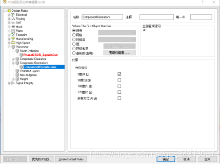 “Component Orientations”规则主要用于设置元器件封装在PCB行的放置方向。选中“Component Orientations”选项,并在该选项上右击,在弹出的快捷菜单中执行“新规则”命令,则在“Component Orientations”选项中建立一个新的子规则,单击新建的“Component Orientations”子规则即可打开设置对话框。