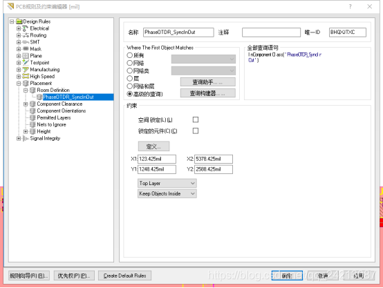 ·“所在工作层及元器件位置设置”:通过最下面的两个下拉列表框来完成。其中,工作层有两个选项,即“Top Layer”和“Bottom Layer”。元器件位置也有两个选项,即“Keep Object Inside”(位于Room空间内)和“Keep Object Outside”(位于Room空间外)。