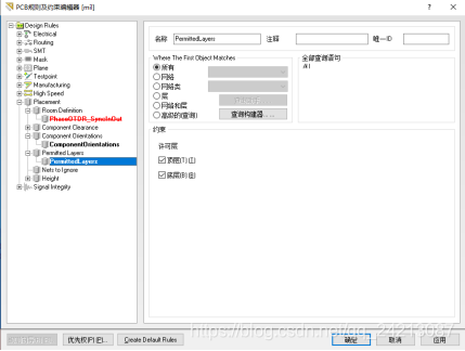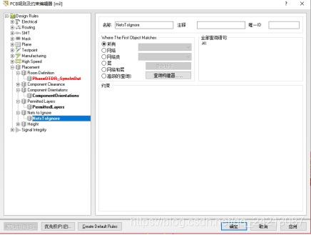 “Nets to Ignore”规则主要用于设置自动布局是可以忽略的网络。忽略一些电器网络(如电源网络、底线网络)在一定程度上可以蹄盖自动布局的质量和速度。
