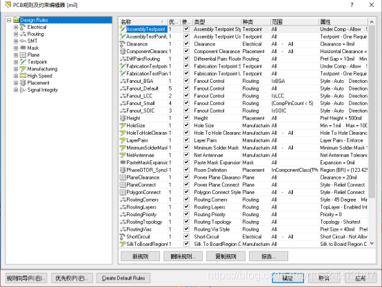 AD系统的PCB编辑器是一个完全的规则驱动编辑环境。系统为设计者提供了多种设计规则,涵盖了PCB设计流程的各个方面,从电气、布局、布线到高频、信号完整性分析等。在具体的PCB设计过程中,设计者可以根据产品要求重新定义相关的设计规则,也可以使用系统默认的规则。如果设计者直接使用设计规则的系统默认值而不加而和修改,是有可能完成整个PCB设计的,只是在后续调整过程中,工作量会很大。因此,在进行PCB的具体设计之前,为了提高设计效率,节约时间和人力,设计者应该根据设计的要求,对相关的设计规则进行合理的设置。