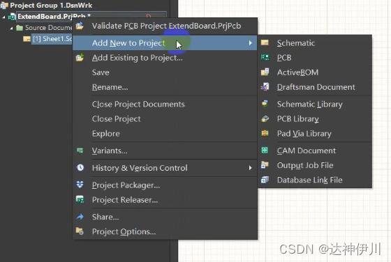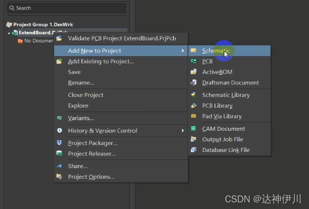 2. 在工程目录下添加SCH文件 Add New to Project - Schematic,以及类似的操作创建PCB。