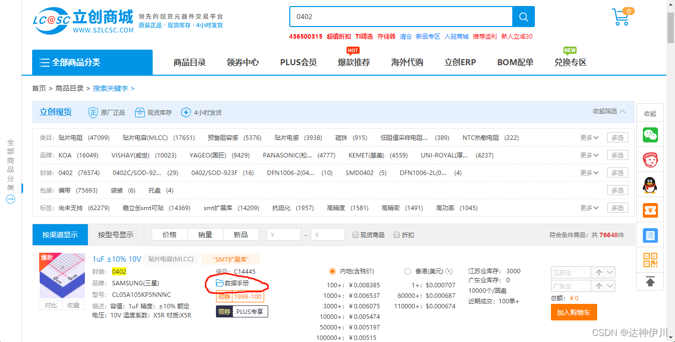 搜索0402贴片电容,找到合适的然后选择 数据手册 。