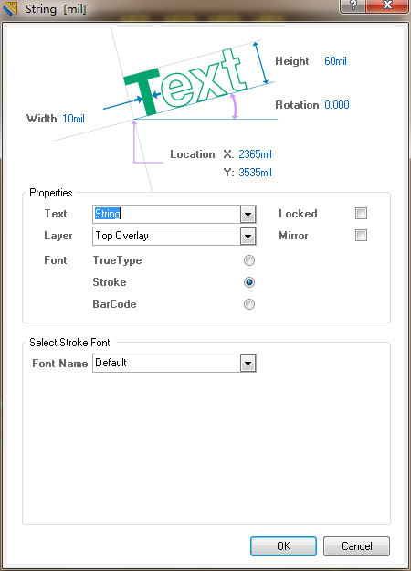 有时在布好的印刷板上需要放置相应元件的文字( String )标注,或者电路注释及公司的产品标志等文字。