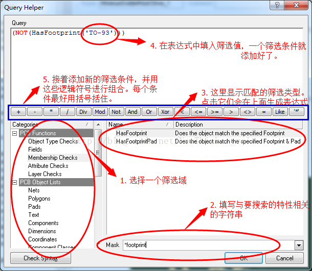 关于表达式的语法和筛选类型的名称,可以通过点击QueryHelper进行查询。我对这个语法也并不熟悉,不过借助Helper对话框,还是很容易找出自己想要的筛选表达式的。Helper对话框如下图。