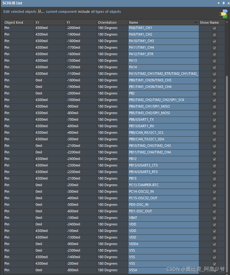1.如果直接按照上图中的Name来命名原理图的引脚名称,有些过于单一。下面提供一种方法可以把复用功能添加到引脚名称中。