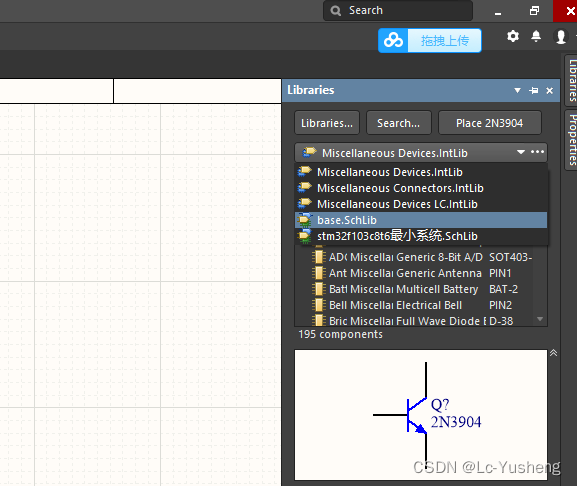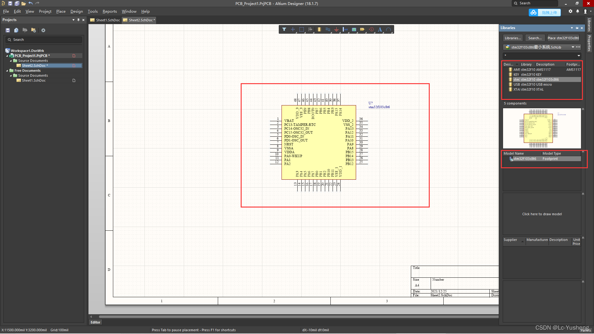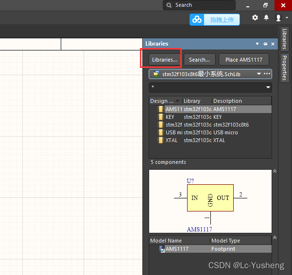 1、选择右侧的 stm32 原件库,找到对应的芯片元件,右键双击,将其放在面板上。