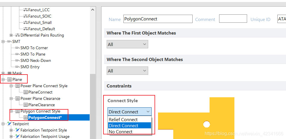 覆铜后发现焊盘处是以十字方式连接的,这个时候点击工具栏Design—>Rules,找到 Plane -->Polygon Connect Style-->PolygonConnect,把ConnectStyle改为Direct Connect,再重新覆铜,可以和之前的效果对比一下,就明白这样做的目的和原因了。当然具体选择哪种方式还需要根据实际情况而定,这里不多解释,只是告诉大家有这样一种设置。