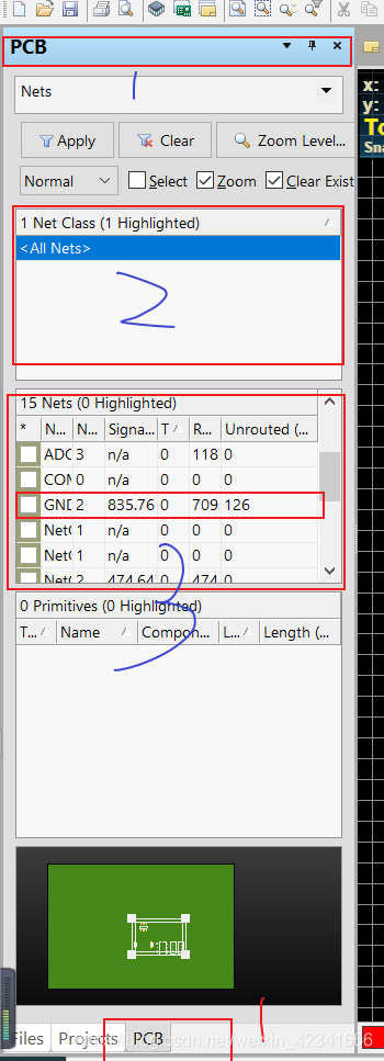 当元器件比较少的时候可以肉眼看出哪些线已经连了,哪些还没有连,但是当元器件比较多,比如有几百条线以上要连时,用肉眼检查就不现实了,所以这个时候还需要通过软件检查有没有遗漏的线。具体为:工具栏View—>Workspace Panels—>PCB—>PCB。这个时候屏幕上会出现PCB的属性窗口,点击区域2的All Nets,在区域3就会出现哪些线还没有连,点击就会跳转到相应地方。