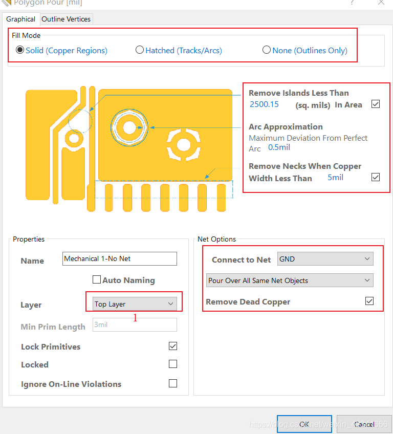 具栏Place—>Polygon Pour,设置相应参数然后点击OK,在PCB上选择覆铜区域。在Top层和Bottom层都需要覆铜,只需要在位置1处选择一下就行了。