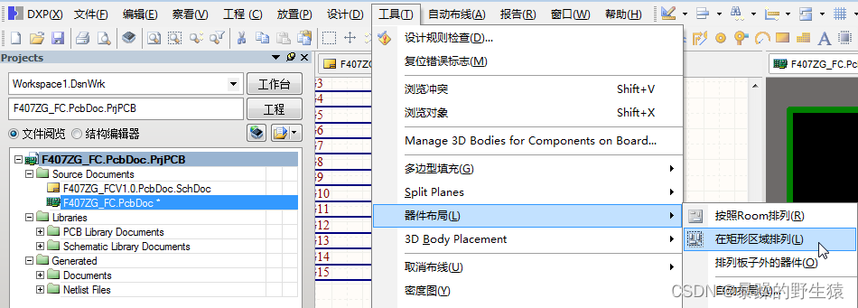 然后我们在PCB区域单击一下(进入编辑PCB状态),依次点击->工具->器件布局->在矩形区域排列: