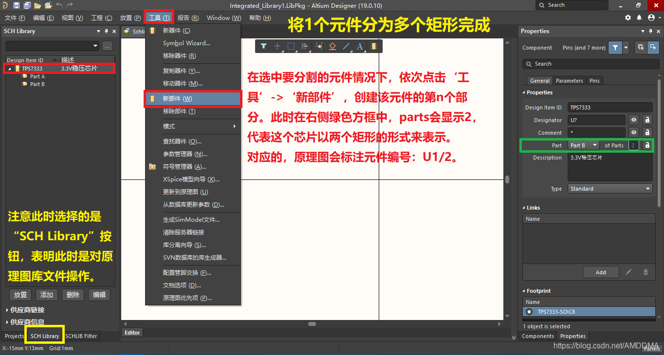 18.1.将元件拆分成多个部分(注:元件拆分后只是在模型上以多个部分表示,并非切割芯片,同时在模型管理器 拉取  PCB封装时和其他简单元件是一样的,需要注意的是多个部分完成的芯片模型,其引脚编号不能乱、重复)