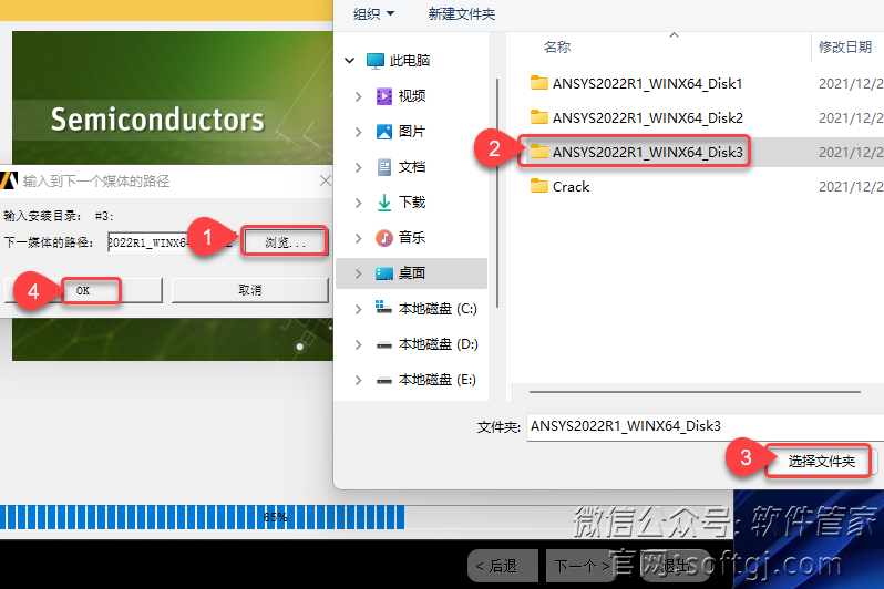 14.当提示输入安装目录:#3时,①点击【浏览】,②选安装包解压后的【ANSYS2022R1_WINX64_Disk2】文件夹中【ANSYS2022R1_WINX64_Disk3】文件夹,③点击【选择文件夹】,④点击【OK】。