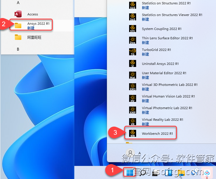 35.在桌面任务栏中,①点击【开始图标】>②【所有应用】>【Ansys 2022 R1】中,③点击需要启动的ANSYS产品图标(如:Workbench)。