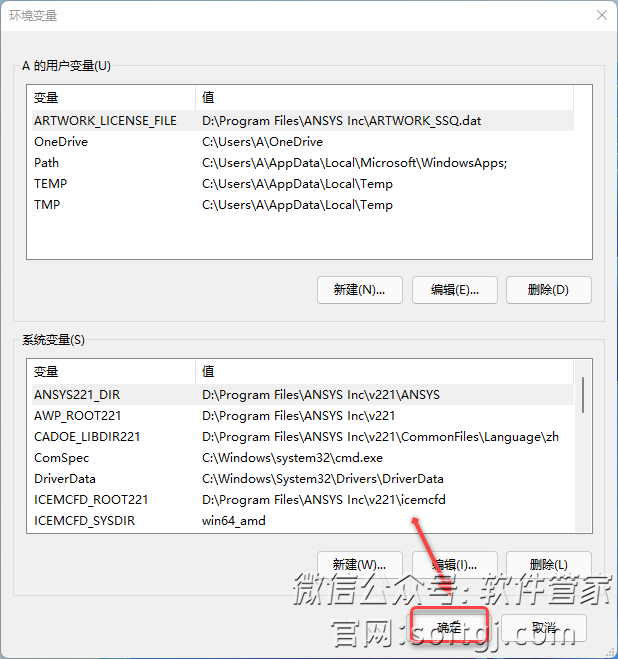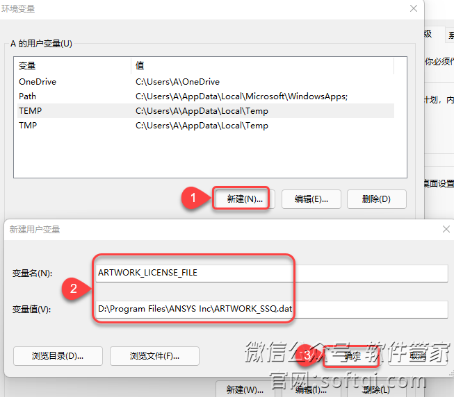 24.在用户变量处:❶点击【新建】,❷输入变量名【ARTWORK_LICENSE_FILE】和变量值【https://www.gofarlic.com\Program Files\ANSYS Inc\ARTWORK_SSQ.dat】(如果您不是安装到D盘,请将首字符D修改为您安装的磁盘符)❸点击【确定】。