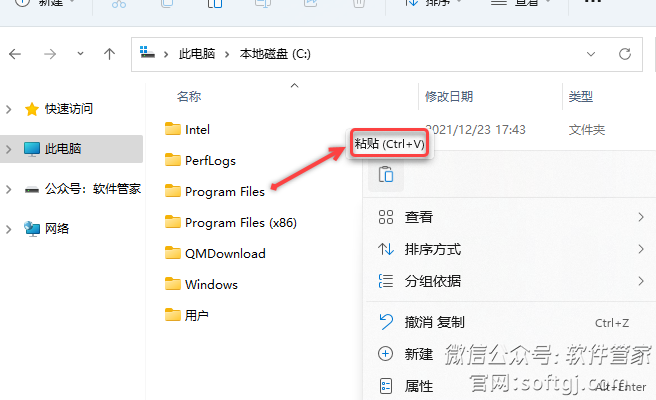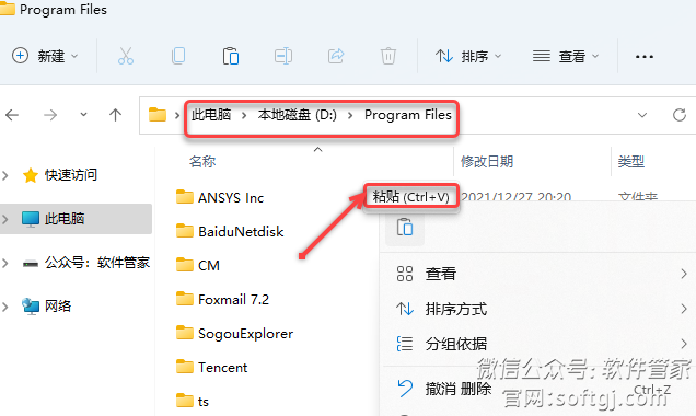 21.打开软件安装位置下的【Program Files】文件夹(步骤6设置的路径,如:https://www.gofarlic.com\Program Files),在空白处右击选择【粘贴】。