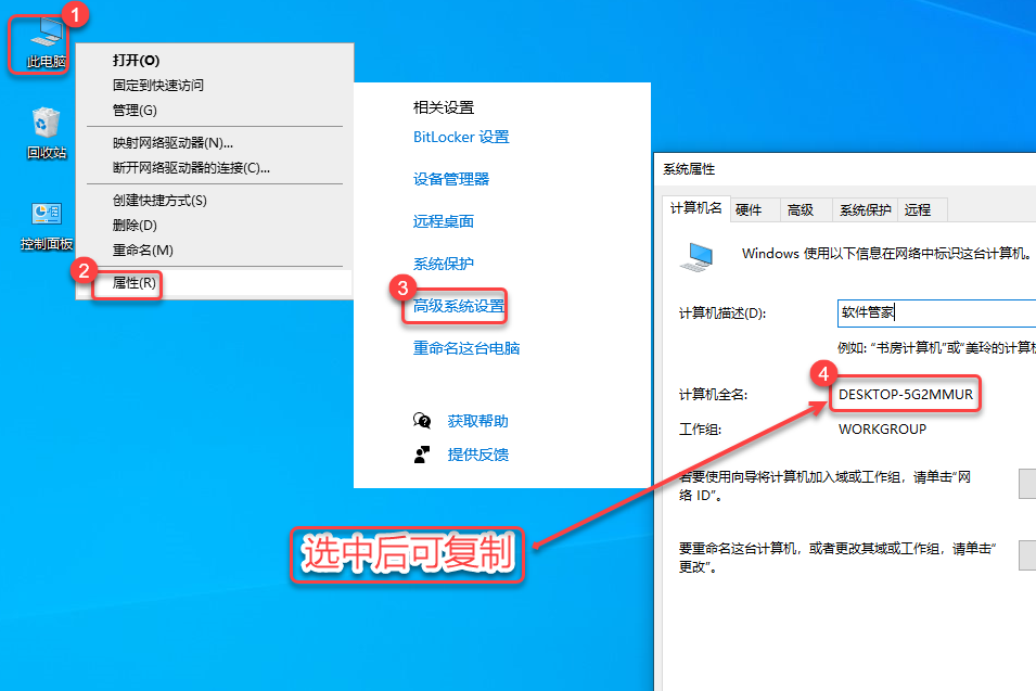附“计算机全名”查看方法:鼠标右击桌面【此电脑】选择【属性】,点击【高级系统设置】,点击【计算机名】(全选计算机全名可复制)。