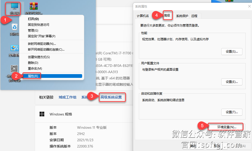 23.❶鼠标右击桌面【此电脑】❷选择【属性】,❸点击【高级系统设置】,❹点击【高级】,❺点击【环境变量】。