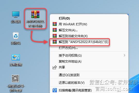 1.鼠标右击【ANSYS2022.R1(64bit)】压缩包(win11及以上系统需先点击“显示更多选项”)选择【解压到 ANSYS2022.R1(64bit)】。