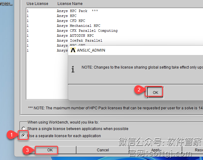 34.①选择【Use a separate license ……】②点击【OK】③点击【OK】。
