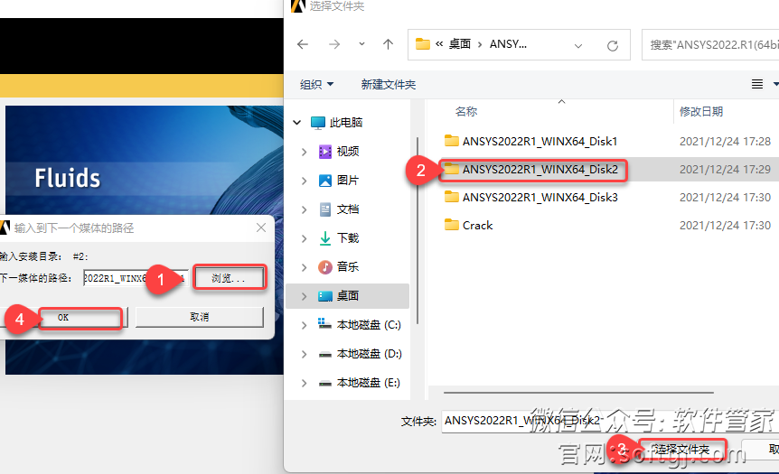 12.当提示输入安装目录:#2时:①点击【浏览】,②选安装包解压后的【ANSYS2022.R1(64bit)】文件夹中的【ANSYS2022R1_WINX64_Disk2】文件夹,③点击【选择文件夹】,④点击【OK】。