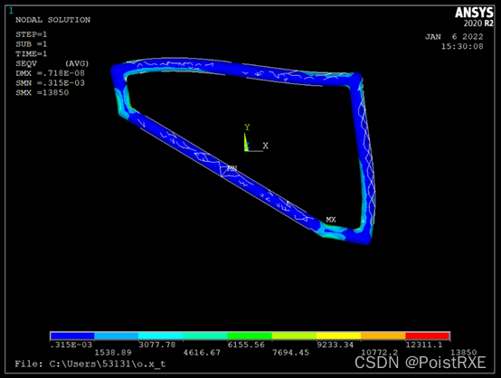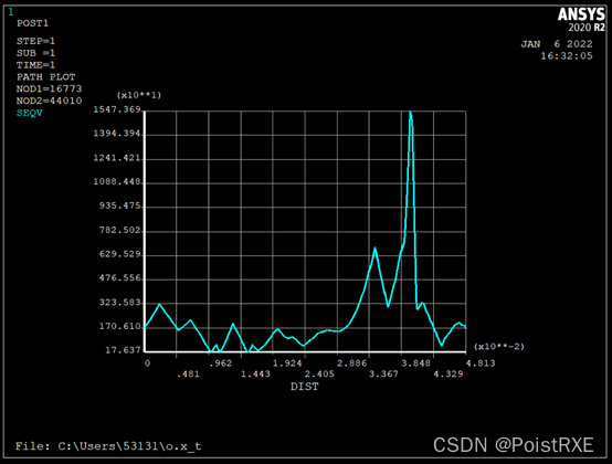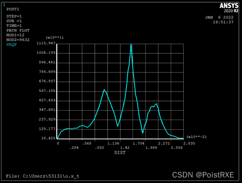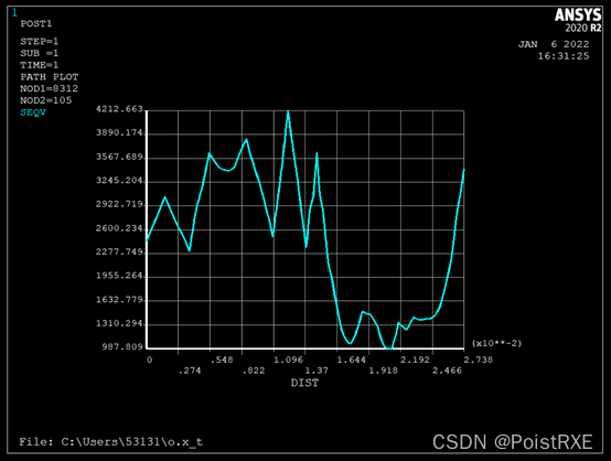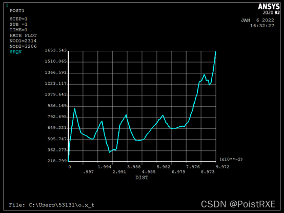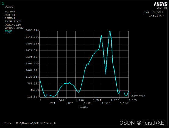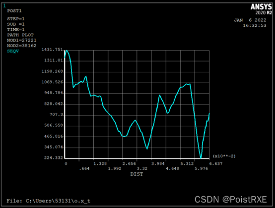(6)进行等效应力分析,Plot Operations-Plot Path Item-On Graph。输出表面路径的A11,A21,A31,A12,A13,A22,得到路径的等效应力分布曲线图,查看各点应力的数值表。