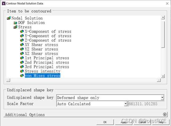 Main Menu--General Postproc--Plot Results--Contour Plot--Nodal Solu--弹出对话框中(如下图)选择Nodal Solution--Stress--von Mises stress--在Undisplaced shape key中选择Deformed shape only