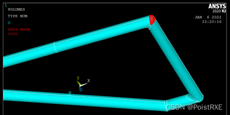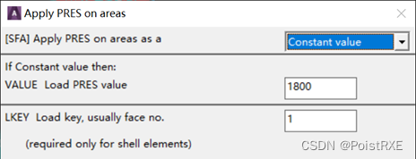 选择Main Menu--Solution--Define Loads--Apply--Structural--Pressure--On Areas--选择下图中的红色面--点OK--弹出的对话框中在VALUE Load PRES value 处设置参数为1800--OK完成