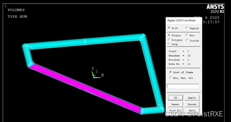 (1)在划分网格之后设置边界条件,选择Main Menu--Solution--Define Loads-- Apply --Structural--Displacement--On Areasà选择下图中的红色面--点OK--弹出的对话框中选择All DOF--OK完成约束。