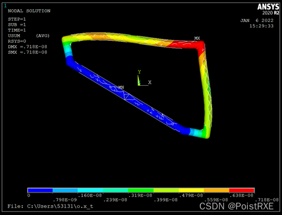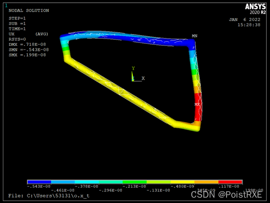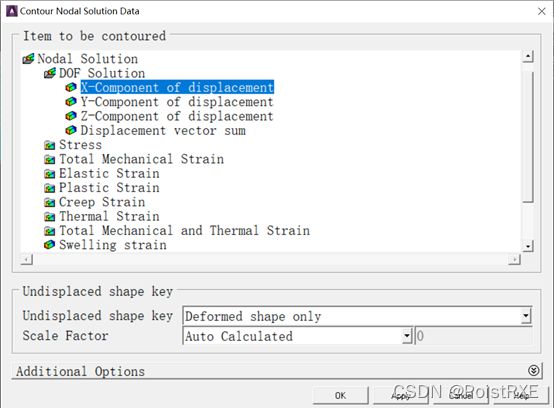 Main Menu--General Postproc--Plot Results--Contour Plot--Nodal Solu--弹出对话框中(如下图)选择Nodal Solution--在Undisplaced shape key中选择Deformed shape with undeformed model(方便区分变形前后的对比)--分别查看X、Y、Z和总的应变图