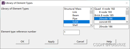 (2)定义属性单元类型(Element Type),选择Preprocessor-Element Type- add /edit/delet-add-solid-20node 186,点击ok。