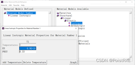 (3)定义材料模型、材料属性和模型组合(Material Models),设置材料属性。Preprocessor-Material Props-Material,Moderls-Structural-Elastic-Isotropic弹性模量输入为6.90E+10,泊松比为0.33。