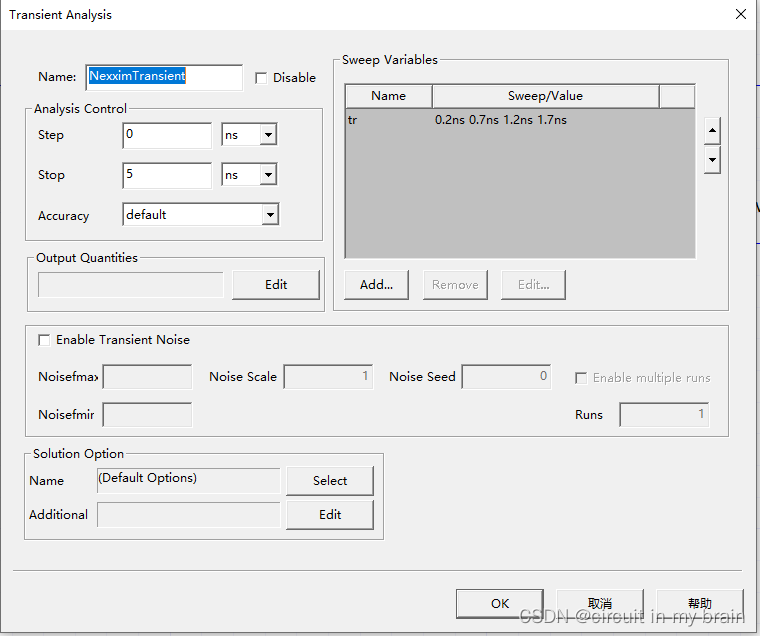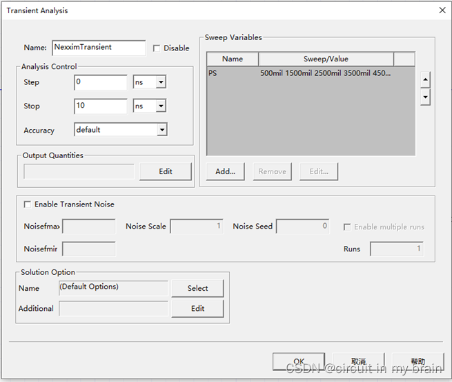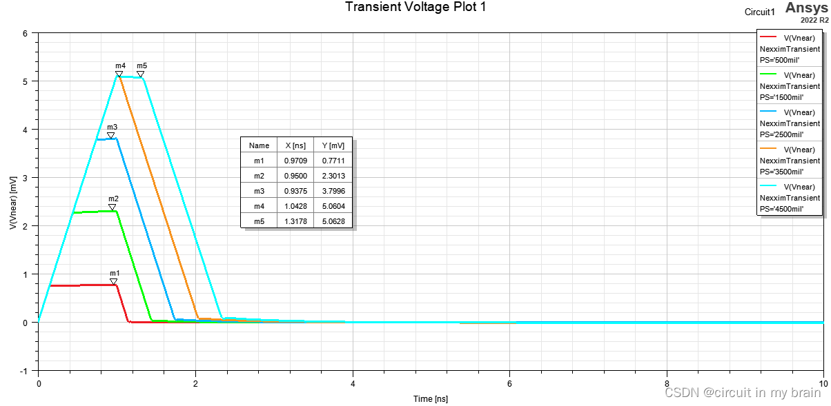 在analysis菜单下增加ps的扫描变量,1ns的边沿,饱和长度为3000mil左右,我们设置500mil 1500mil 2500mil 3500mil 4500mil这几个耦合长度