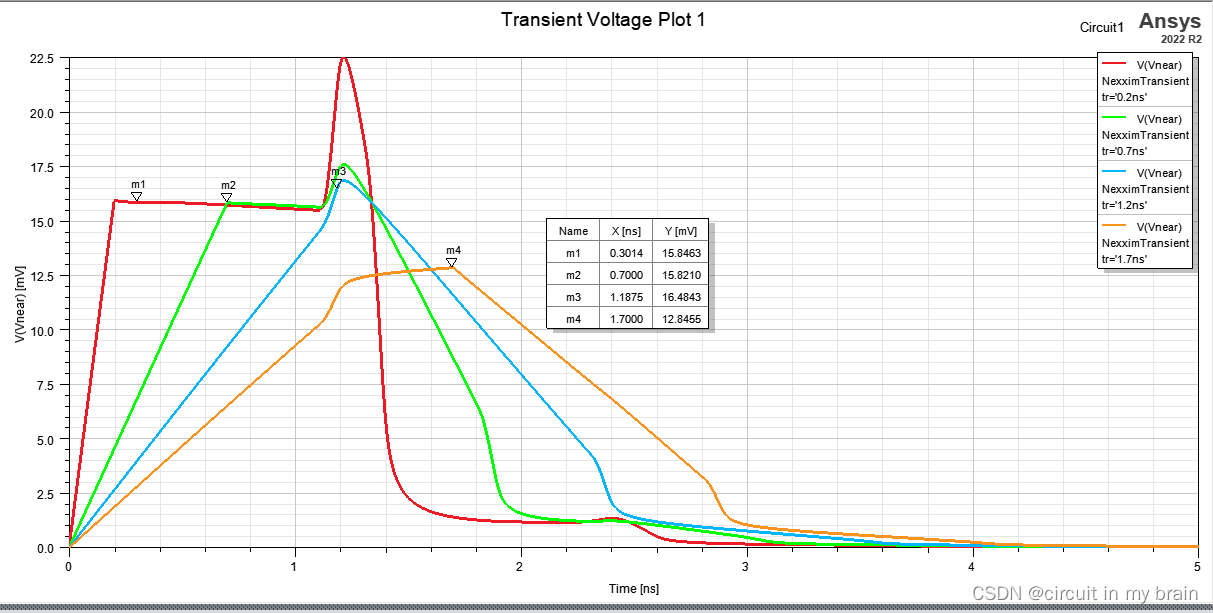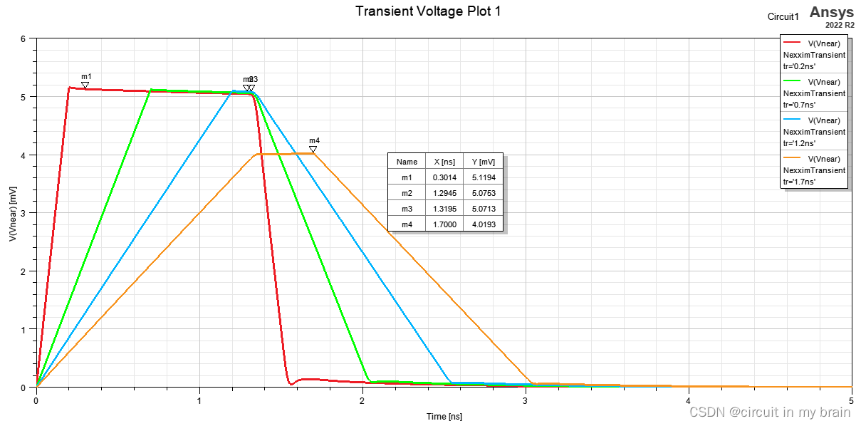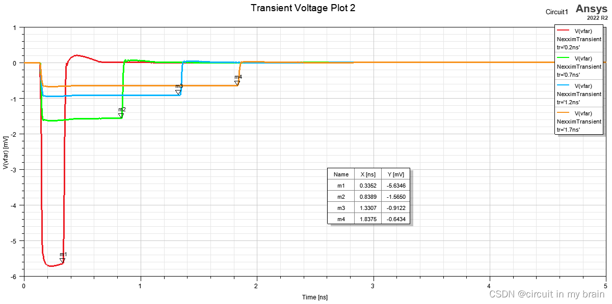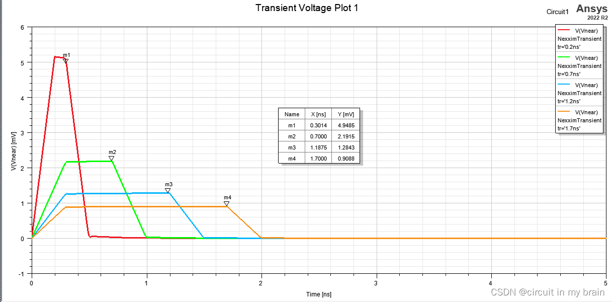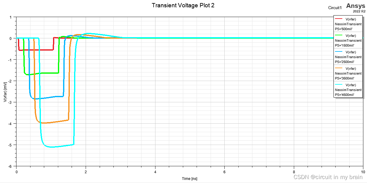 耦合长度修改为4500mil以后0.2ns 0.7ns 1.2ns这三个边沿的饱和长度都小于耦合长度了,可以看出: