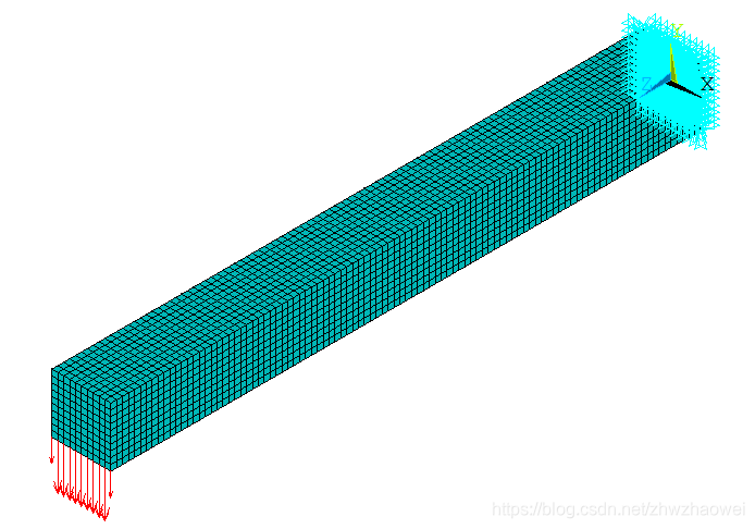 悬臂梁尺寸为10*10*100mm,右端面固定,左端面受到竖直向下的作用力,如下图所示