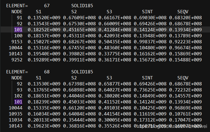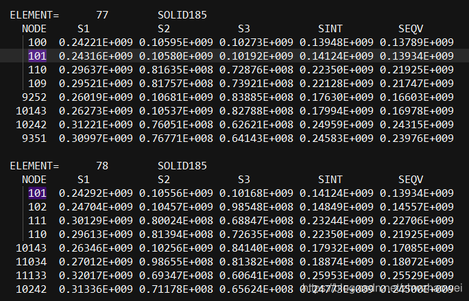 具体来看一下,取101号节点(方便查找)的SEQV=0.13934e9,它它是单元67,68,77和78四个单元的共节点,分别把四个单元的SEQV加起来再求平均=0.13934e9,可以看出单元中的相同节点的节点解的平均就是节点解。