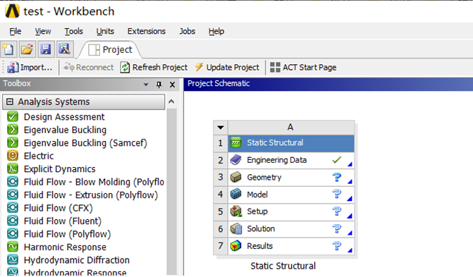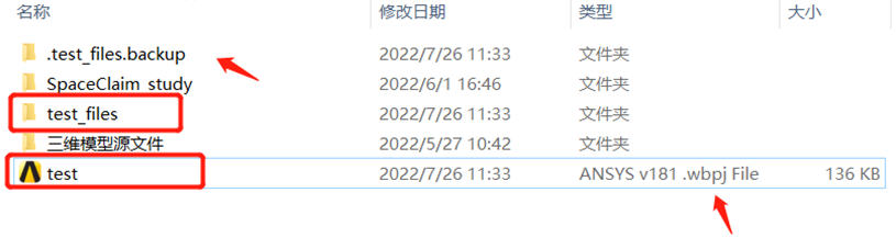 如下新建的一个test工程 项目 ,根目录文件夹内包含三个文件:test.wbpj、test_files和.test_files.backup文件。Backup文件是缓存文件,当我们关闭ansys后,该文件就会消失并更新test_files文件,而其余两个文件都是关键数据文件。