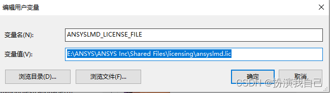 选中用户变量中ANSYSLMD_LICENSE_FILE,点击编辑,出现如下界面: