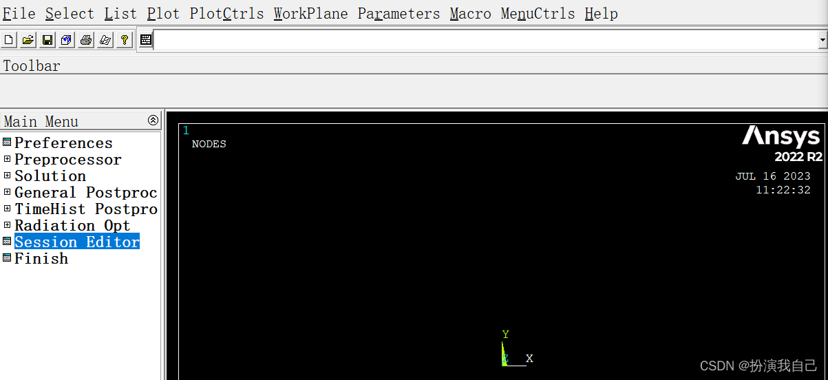 5、在APDL左侧菜单栏中点击Session Editor ,在出现的界面中找到如下图所示的那一段代码(注意开头和结尾),将这一段代码复制到一个文本文件中保存以备后用;